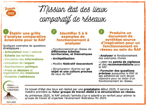 L’objectif de cet état des lieux est de pouvoir s’inspirer de fonctionnements existants dans d’autres réseaux de l’ESS, plutôt que de partir d’une page blanche. Les modèles de fonctionnement en réseau seront ensuite analysés à l’aulne des spécificités des alternatives forestières, et il sera possible de « piocher » parmi les différents modèles analysés. Ce travail sera la matière première du Groupe de travail « structuration en réseau / Ramifications » qui va se constituer cette année.