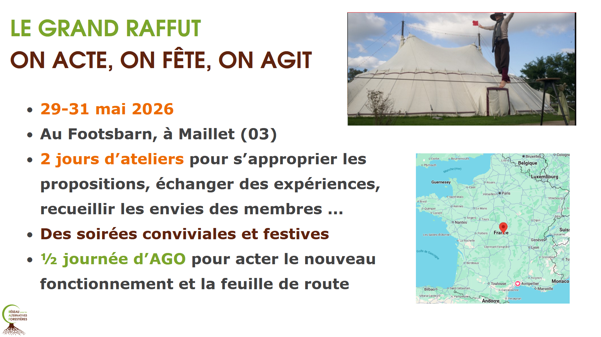 🪓 Le Grand Raffut sera le moment où le RAF passe un cap : un événement fédérateur pour partager, débattre et décider ensemble du fonctionnement du réseau que nous voulons construire.